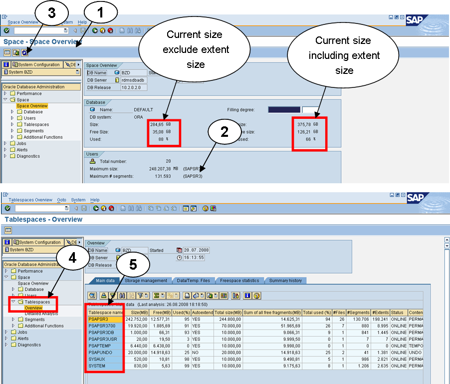 1. DB02 show the Space Overview e.g. current Database size, free size and total free size including extent size.