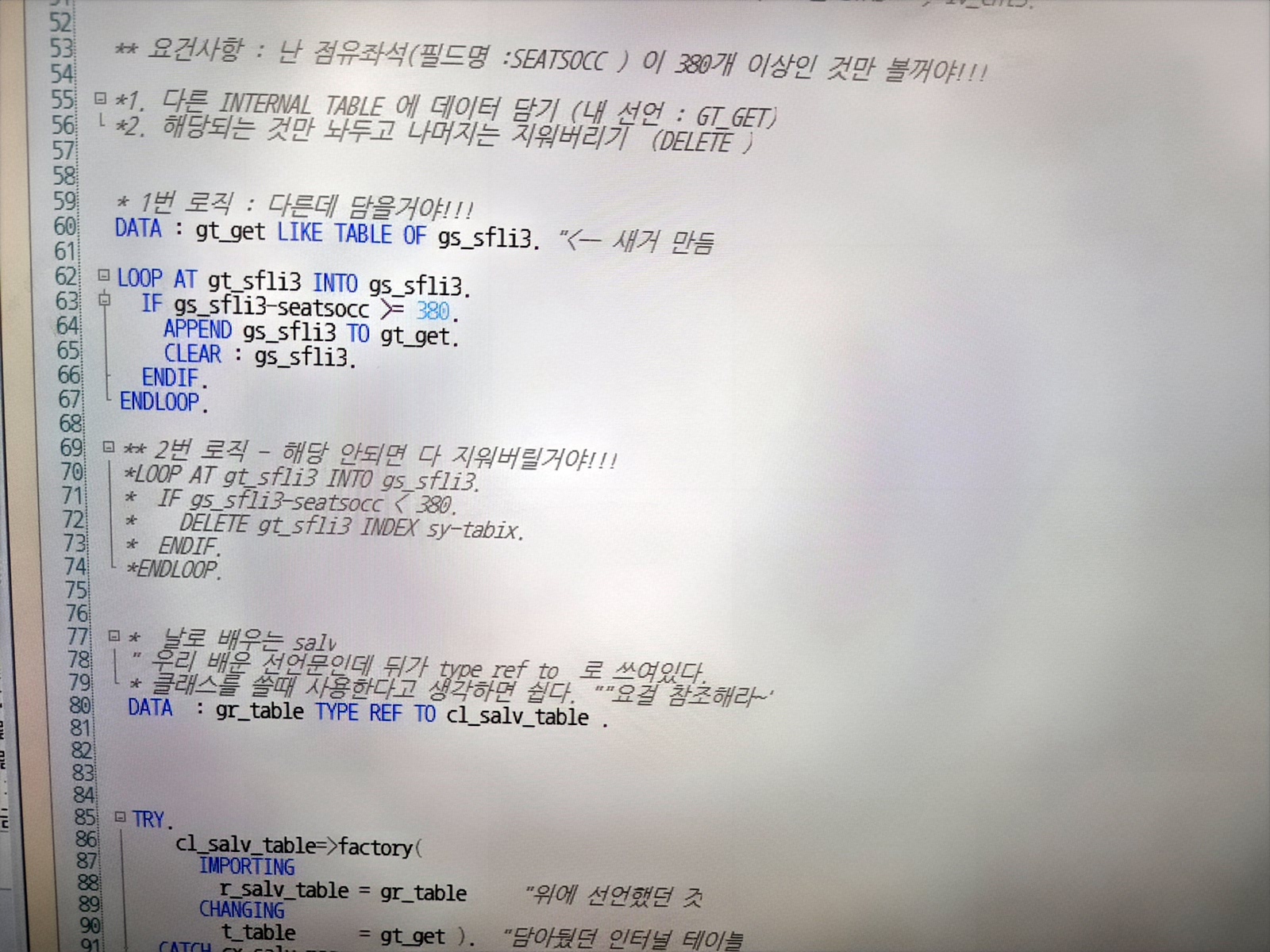 1. 새로운 itab (GT_GET) 을 선언해서 거기다 좌석수 380개 이상인 라인을 다시 담는 방법